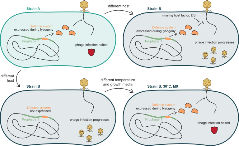 Interestingly, the authors found that defense strength varied not only with the system itself but also with genetic and environmental context. Defense phenotypes were often stronger in the E. coli ECOR13 background than in E. coli K-12, and many were more active in minimal medium at a lower temperature. In some cases, these differences were not explained by transcriptional changes, pointing instead to post-transcriptional regulation or interactions with host factors or other defenses. This has implications for how prophage-encoded defense may behave when horizontally transferred, since systems that are active in one background might be inert in another, and vice versa.