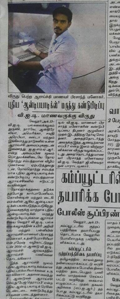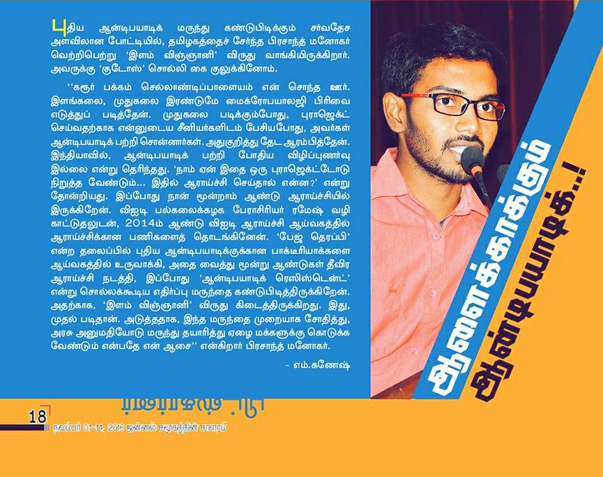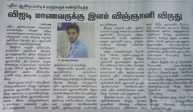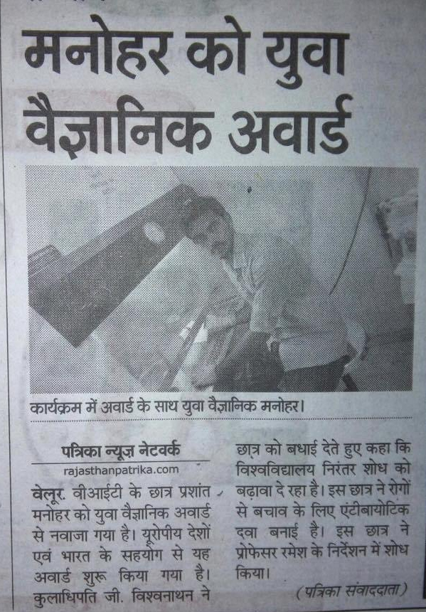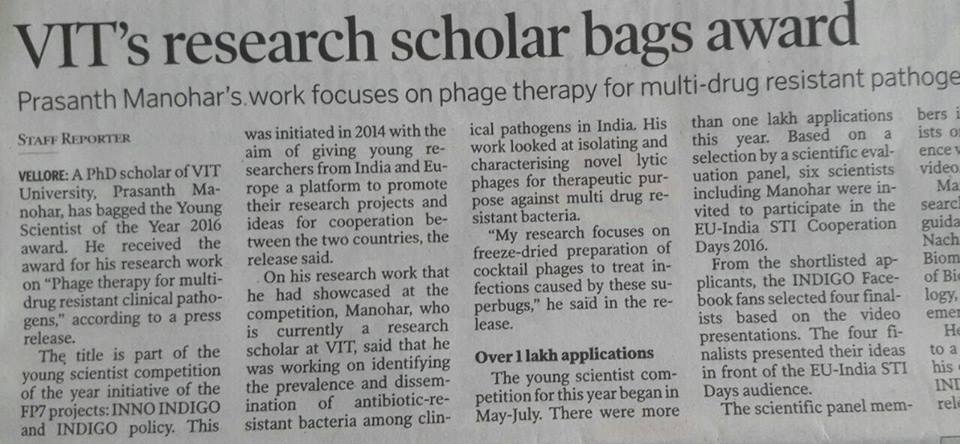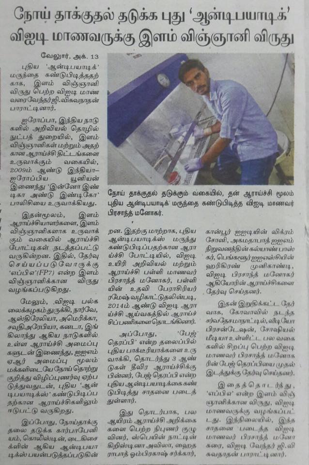 HomeGallery Gallery IN NEWS Indian Express News, 2016Hindu News, 2016Rajasthan Patrika News, 2016Dinamalar News, 2016Dinakaran News, 2016The Hindu News, 2016Jannal News, 2016ECCMID2020 30 under 30 “YOUNG SCIENTIST”ZJU institute NEWS in ChineseYOUNG Scientist Award 2021VIT recognition -100 facts about VITVIT AlumniECCMID Young Scientist Award ECCMID conference 2017Member of Royal Society of BiologyPostdoctoral FellowshipPostdoctoral CertificatePatent – As an inventor, 2023Award at Texas ASM meeting 2024 Share this: Share on X (Opens in new window) X Share on Facebook (Opens in new window) Facebook Like Loading...